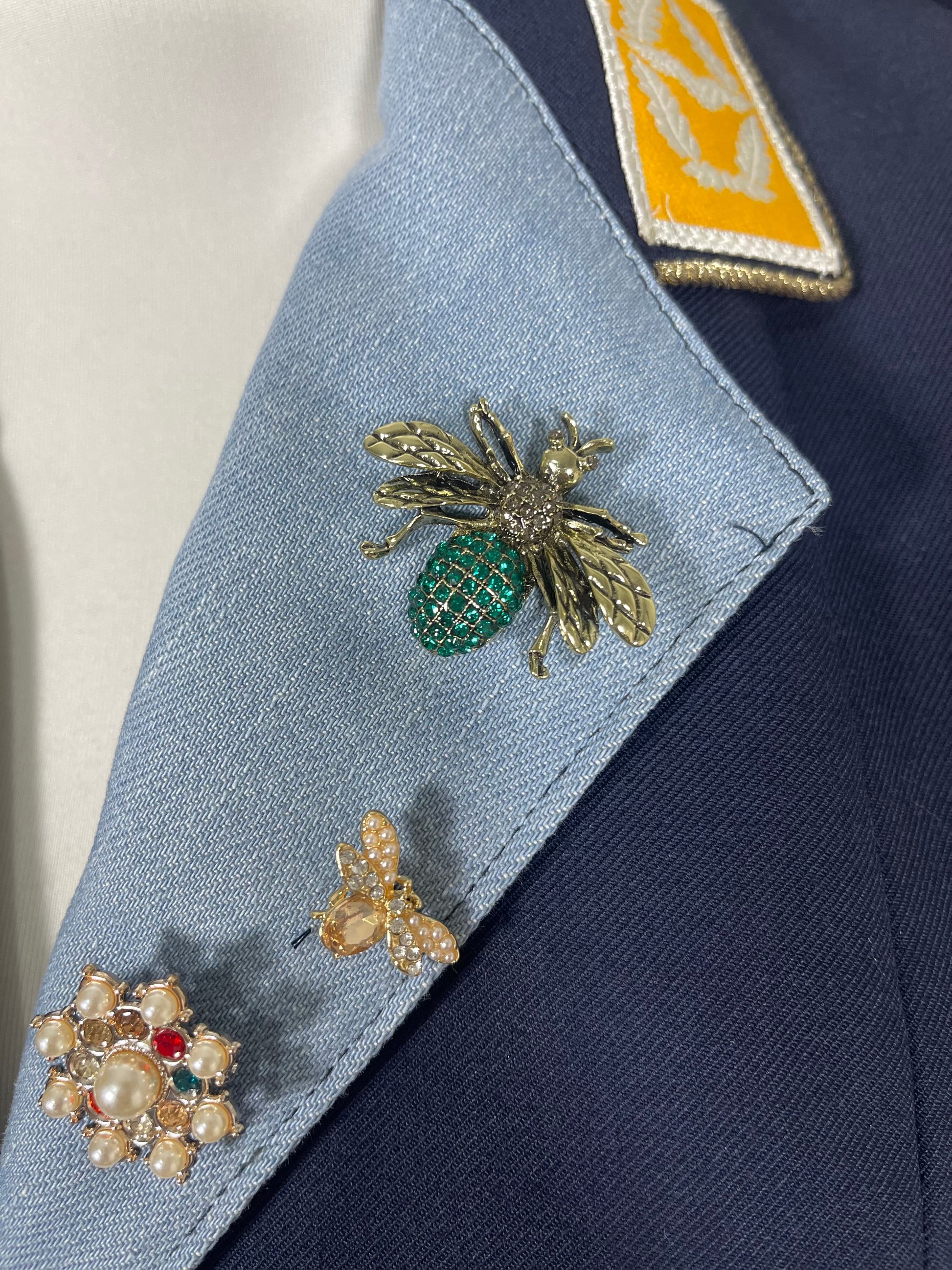 • Applicazioni "Floral & Bug": Sul davanti spicca una grande rosa in tessuto giallo ocra, accompagnata da diverse spille a forma di insetto (api e scarabei) tempestate di brillantini e perle, che aggiungono un tocco di stravaganza "maximalist".