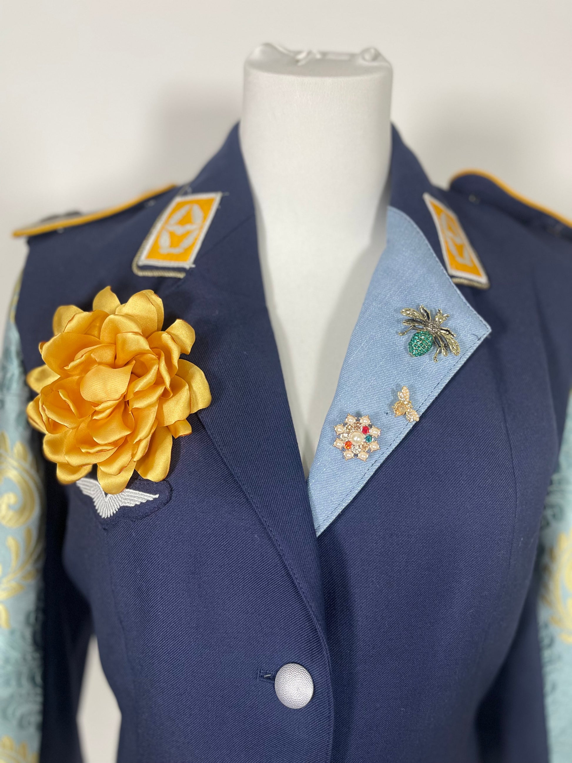 • Base Militare: La giacca mantiene il classico colore blu avio e la struttura sartoriale tipica delle divise militari, inclusi i bottoni metallici originali e le mostrine gialle sul colletto.
