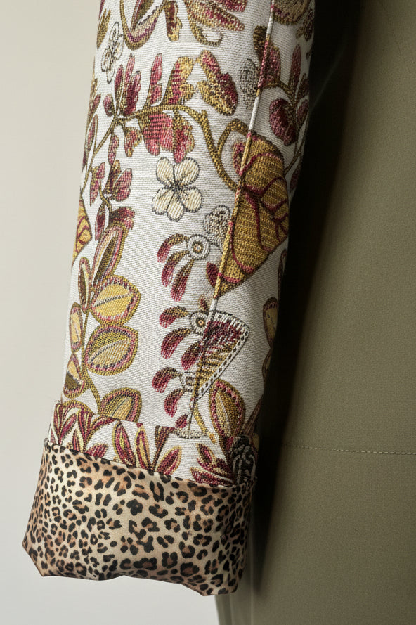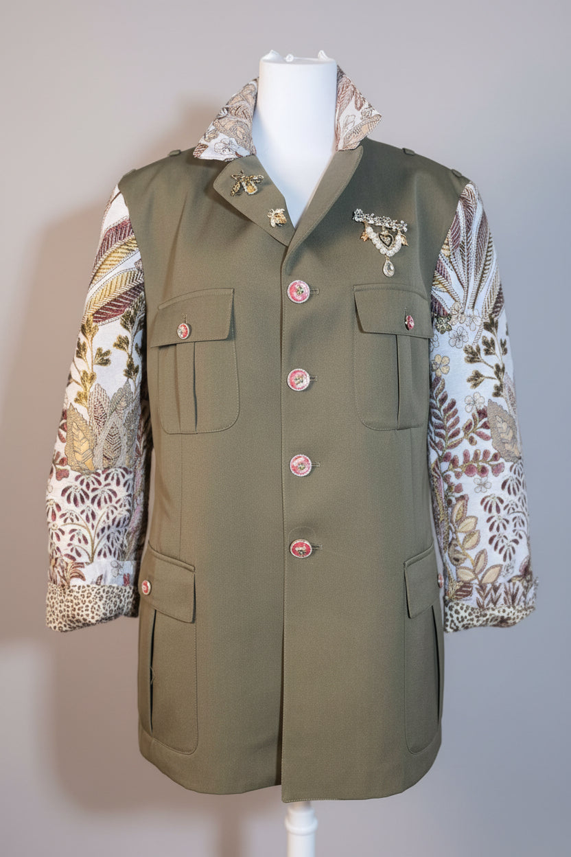 Il Blazer Ermia è un capo di abbigliamento di upcycling, realizzato da giacche dell'esercito italiano. Presenta maniche in gobelin floreale che offrono un contrasto elegante, mentre le applicazioni di spille sparkling nel revers e sul davanti aggiungono un tocco distintivo. Questa combinazione di materiali e design accresce l'unicità e la versatilità dell'indumento.