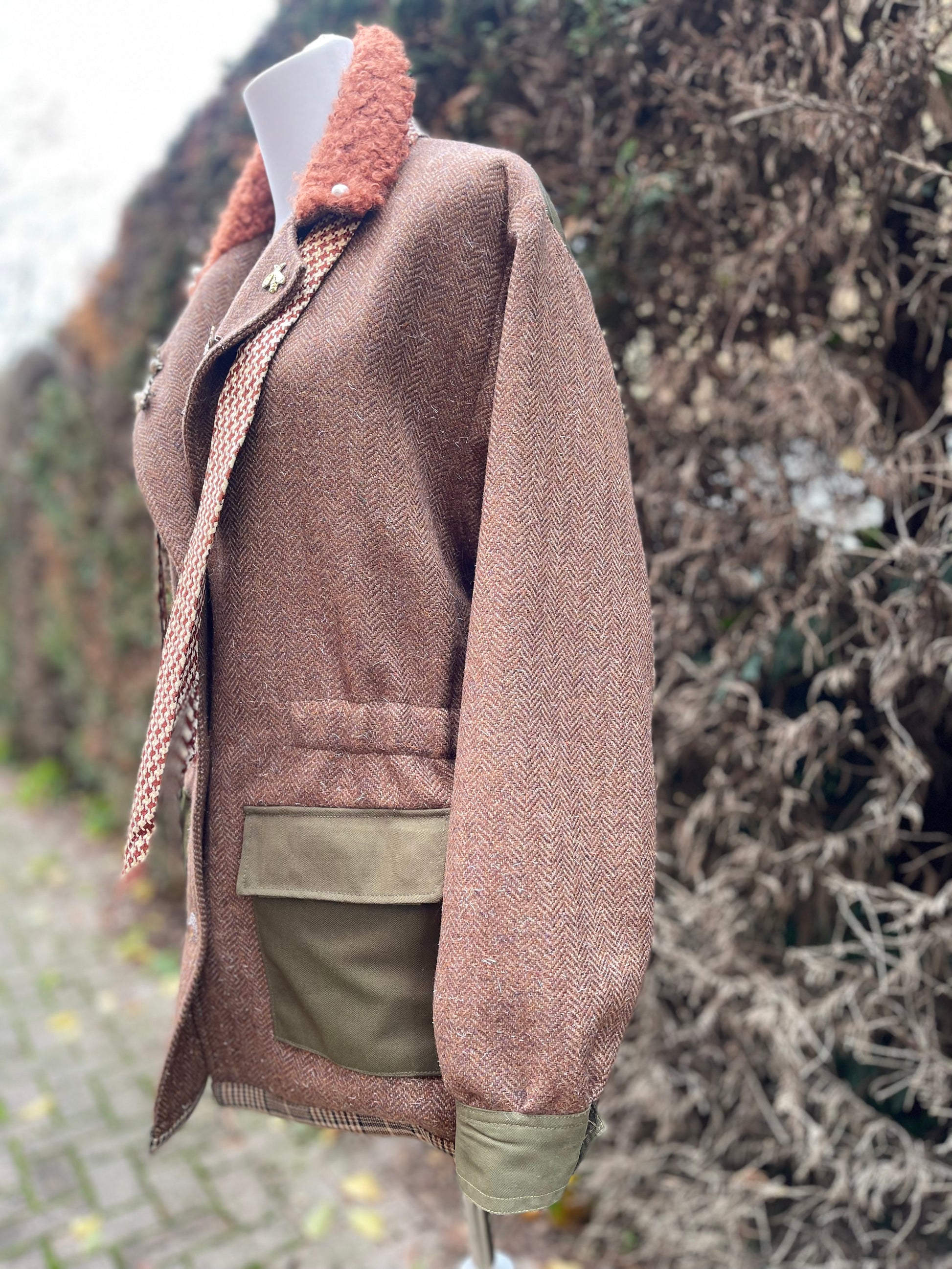 Il Blazer Nicol è un capo di alta qualità realizzato con un tessuto in lana spigata proveniente da una giacca militare italiana. Grazie al processo di upcycling, questo blazer è sia eco-friendly che unico nel suo genere. Il revers arricchito da spille gioiello conferisce un tocco elegante e sofisticato a questo blazer versatile e originale.