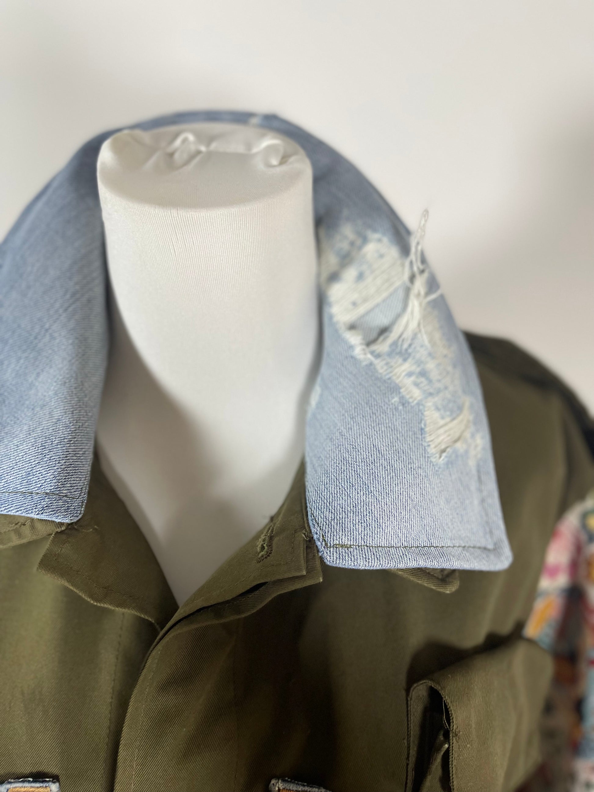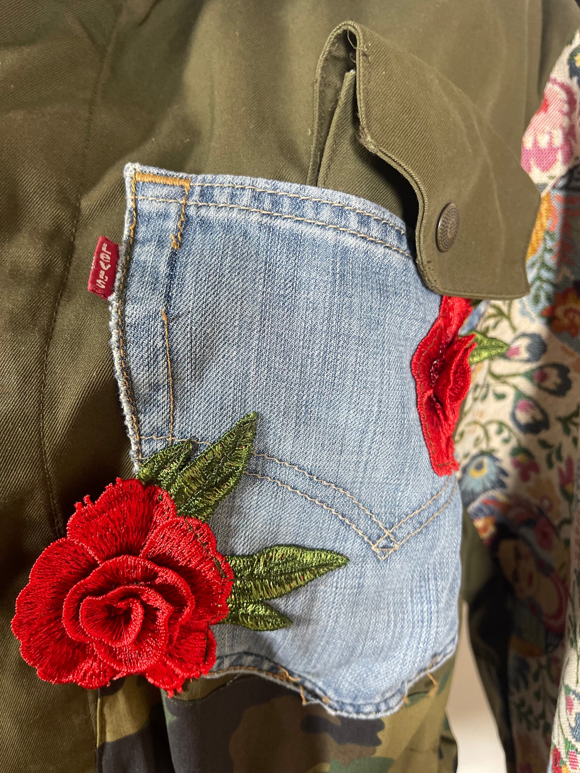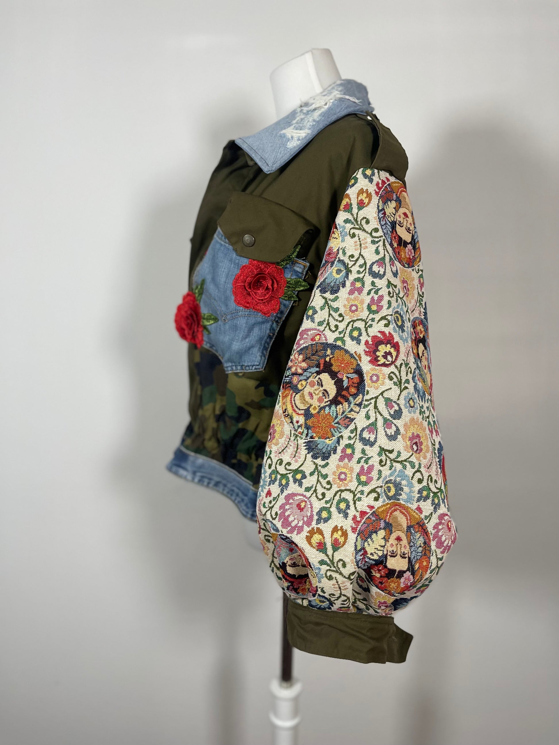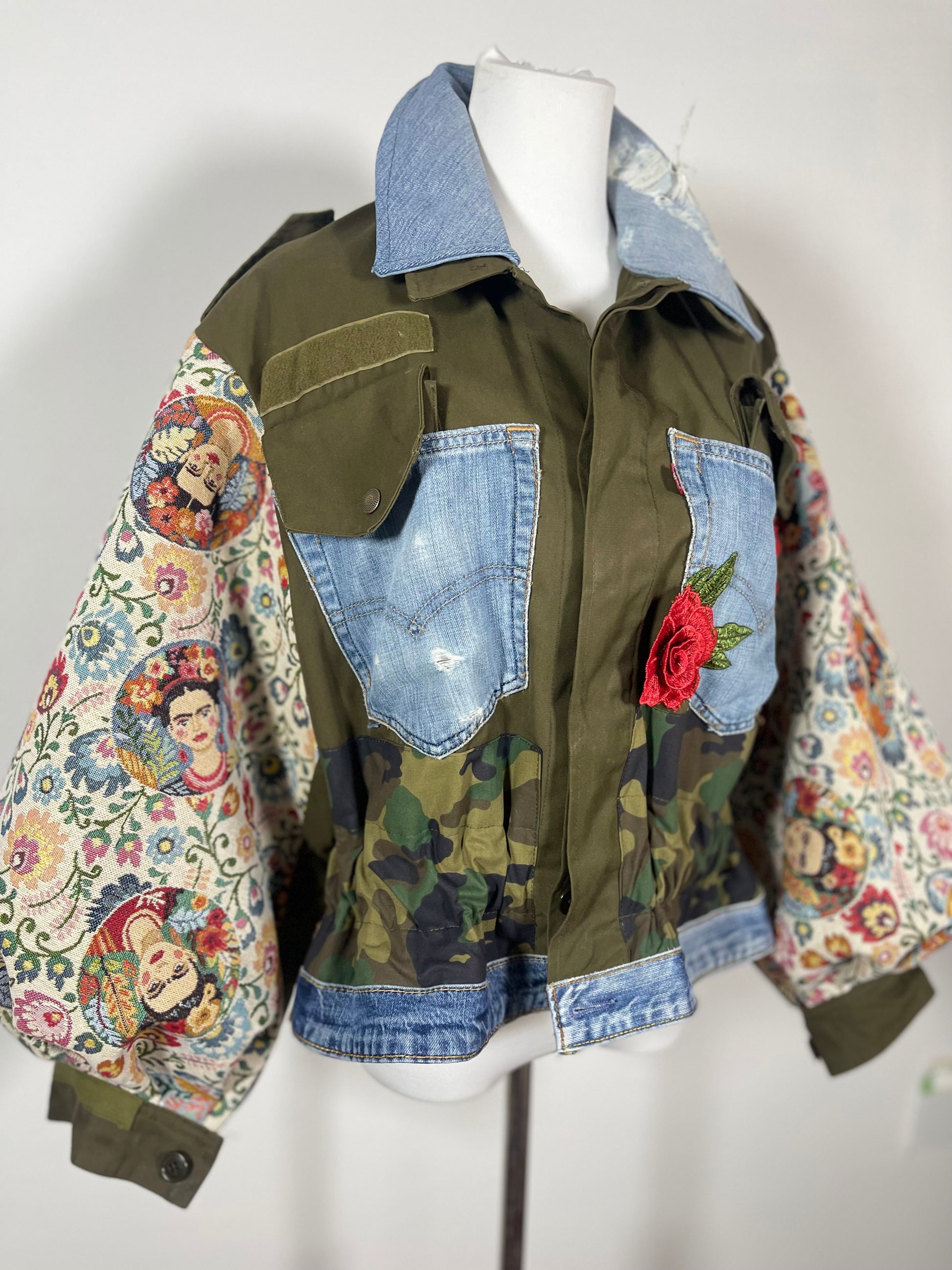 L'esclusivo Bomber Carmela è realizzato utilizzando giacche militari trasformandole in bomber eleganti e moderni. Ogni giacca è unica, una con una stampa di Frida Kahlo. Fatti notare con uno stile unico e sostenibile.