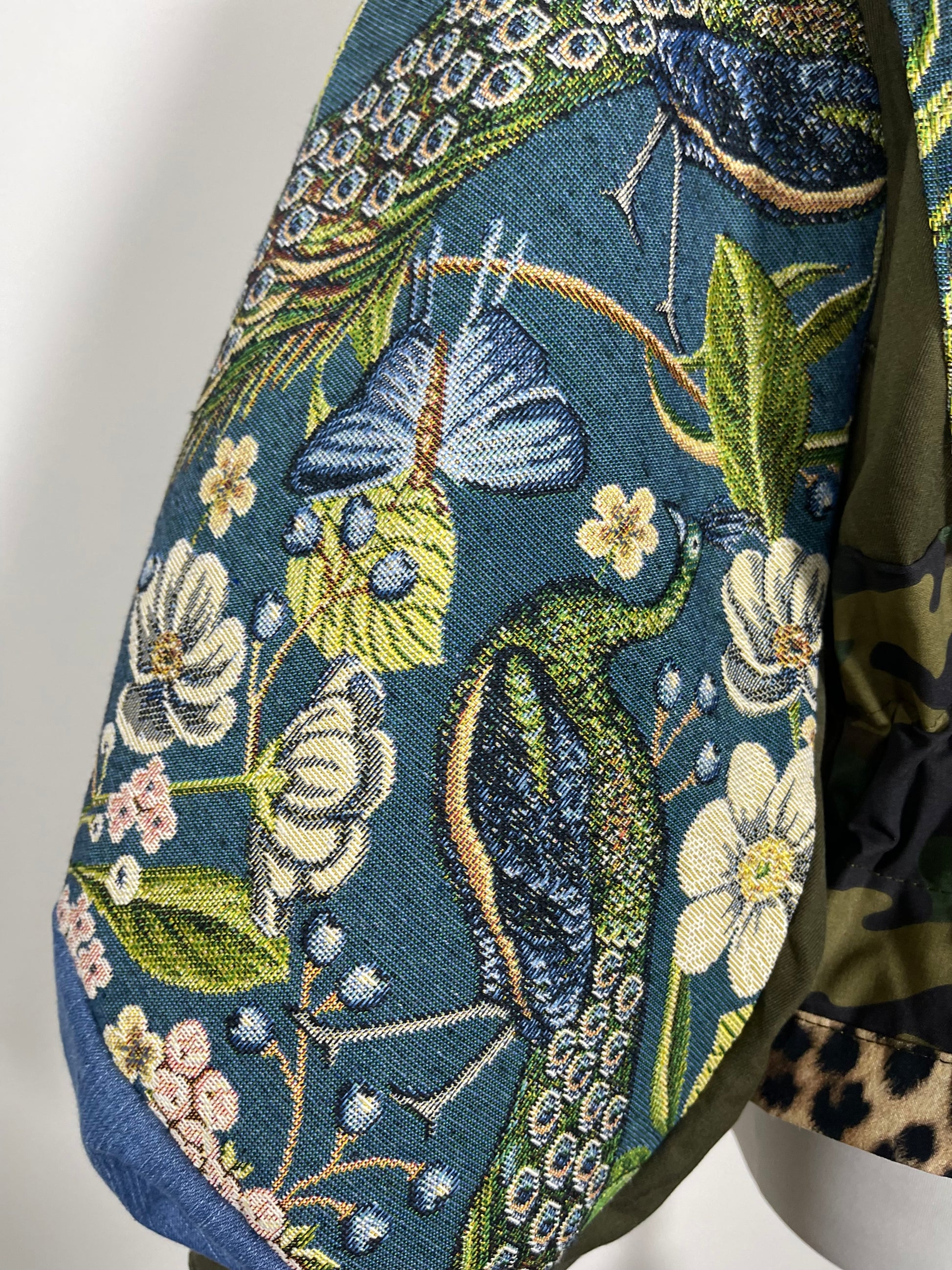 • L'Eredità: Il robusto cotone drill verde oliva originale mantiene le tracce della sua storia funzionale, ma viene stravolto da inserti camouflage e animalier che creano un contrasto urbano e graffiante.