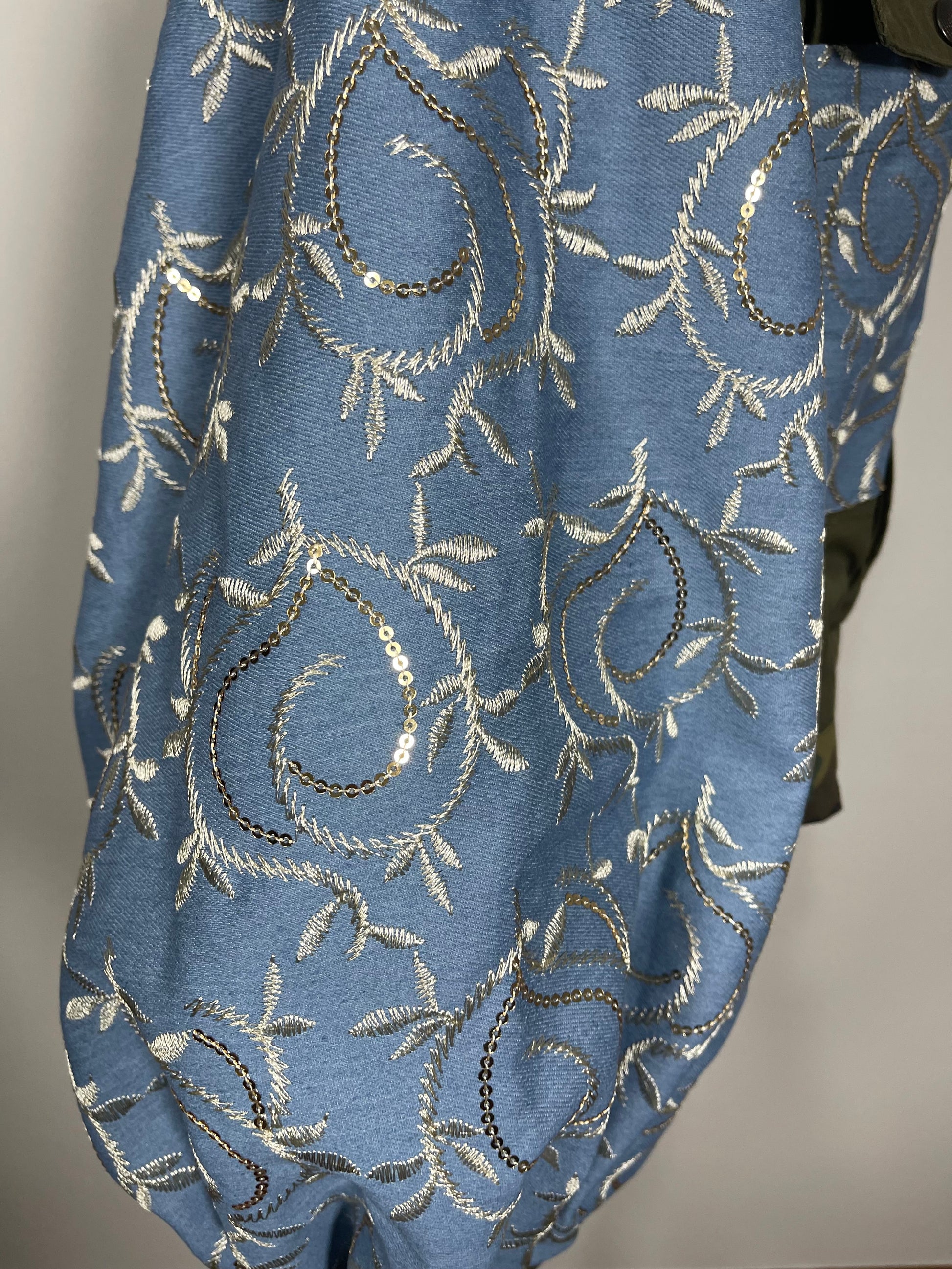 • Inserti in Broccato Azzurro: Il colletto, le maniche e le ampie tasche frontali sono impreziositi da un tessuto azzurro polvere con ricami floreali a rilievo e micro-paillettes che catturano la luce.