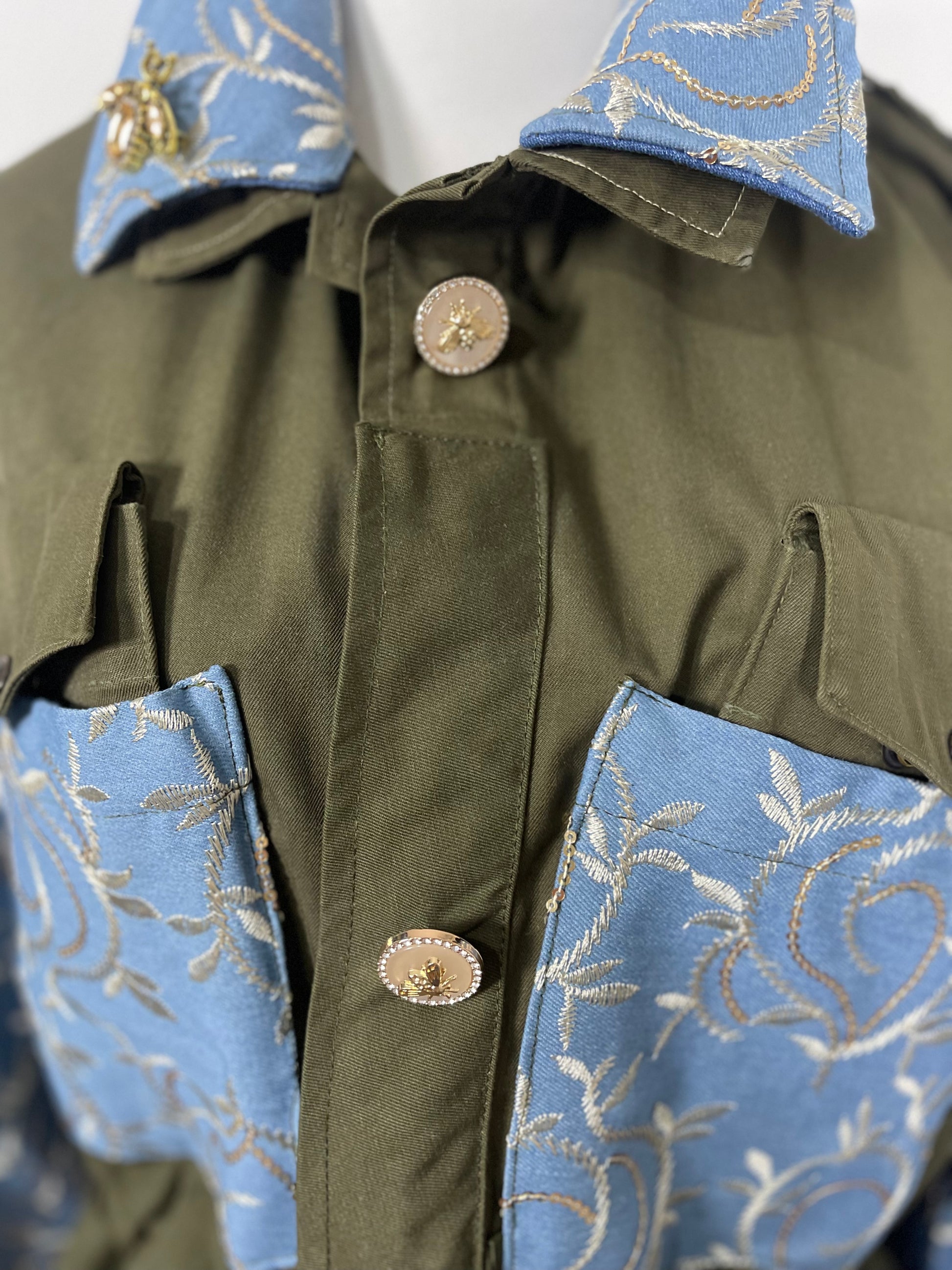 Il contrasto è il cuore pulsante di questo capo. La robustezza del tessuto olivo militare incontra l'eleganza eterea di inserti preziosi, creando un profilo audace e sofisticato.