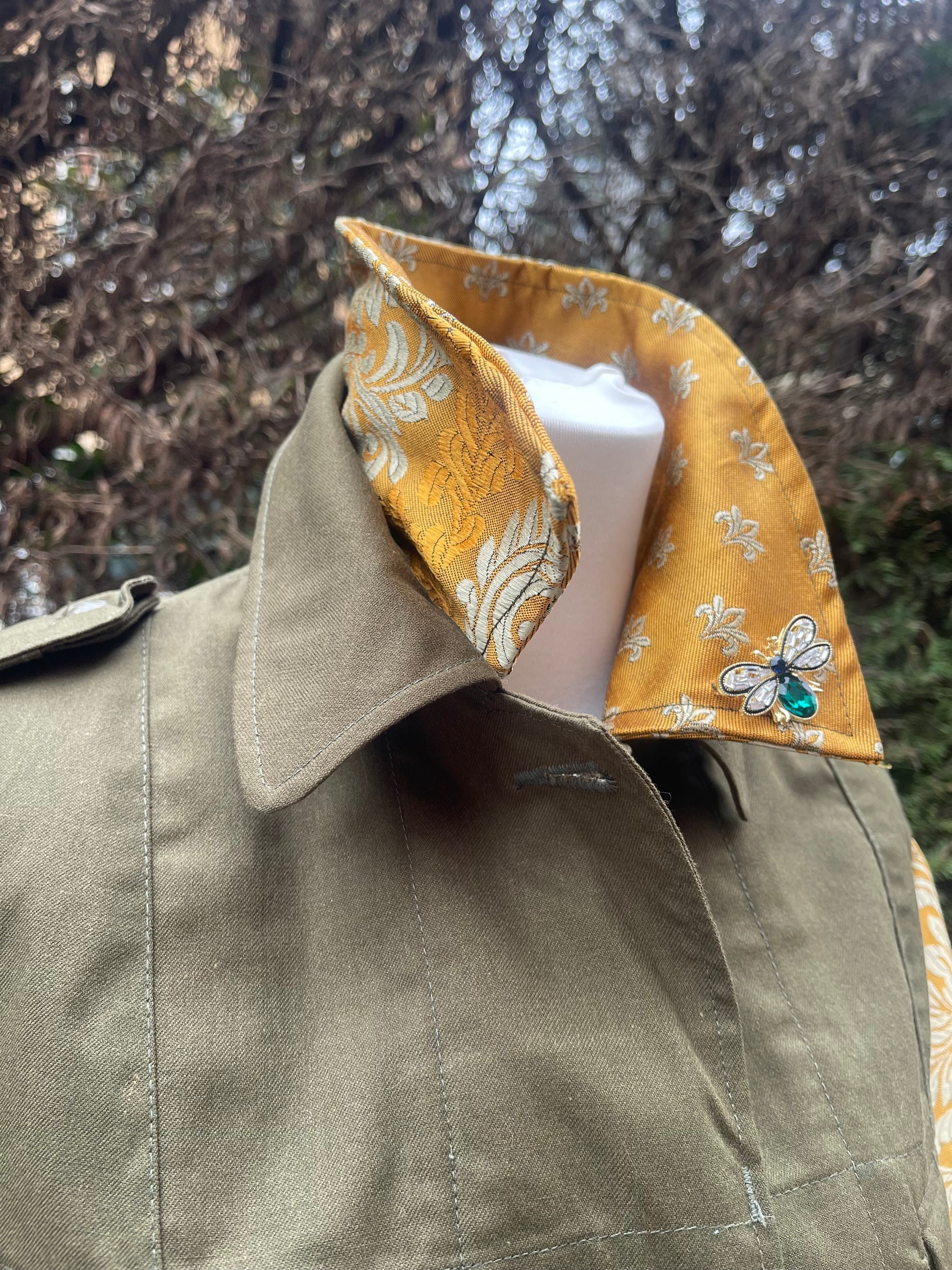 Il Bomber Rococò è un capolavoro di upcycling, realizzato da una giacca militare cecoslovacca. Le maniche baloon in damascato aggiungono un tocco di eleganza e unicità. Questa combinazione non solo preserva la storia del materiale, ma offre anche un prodotto distintivo e sostenibile, ideale per chi cerca moda con un significato.