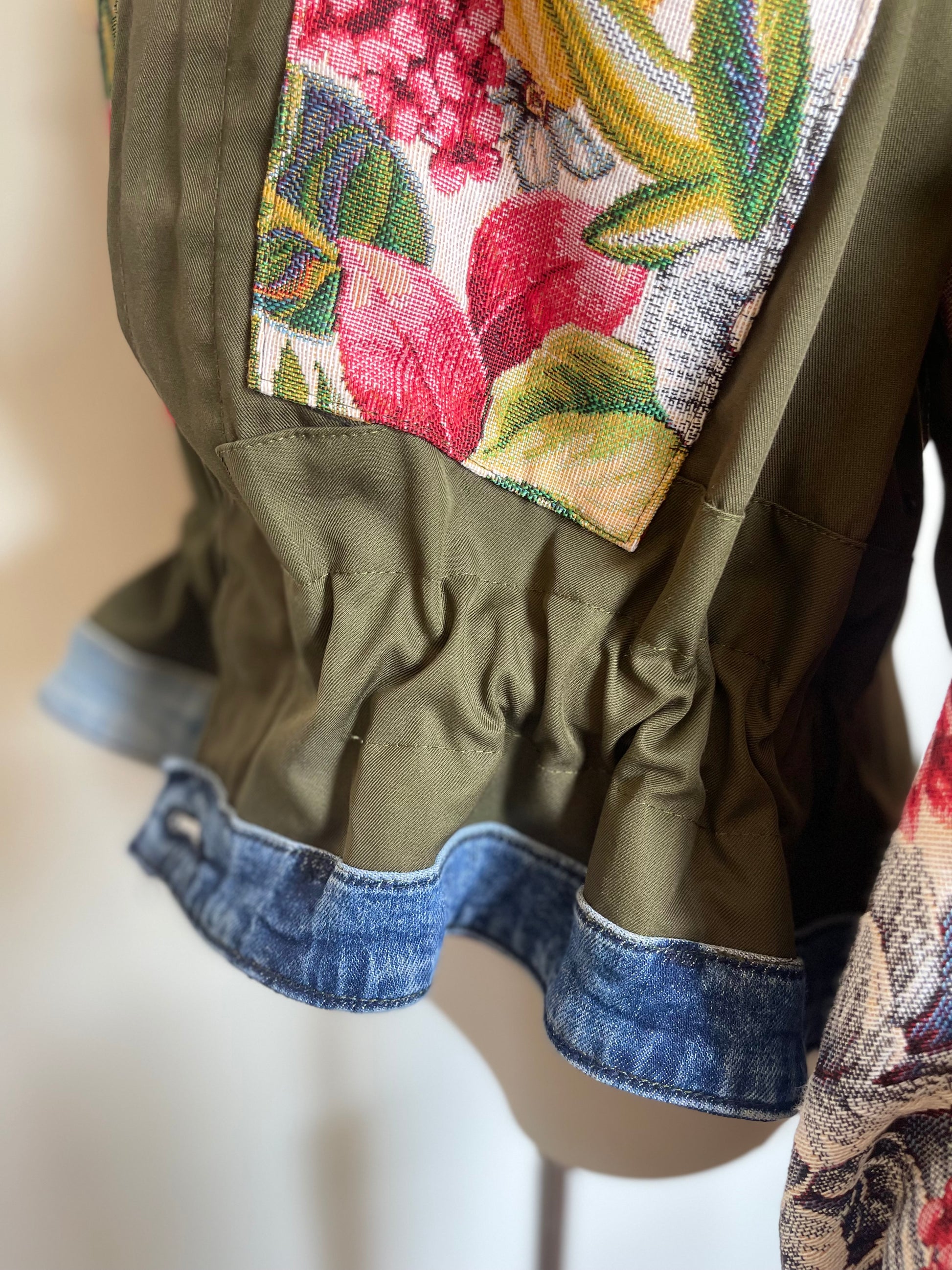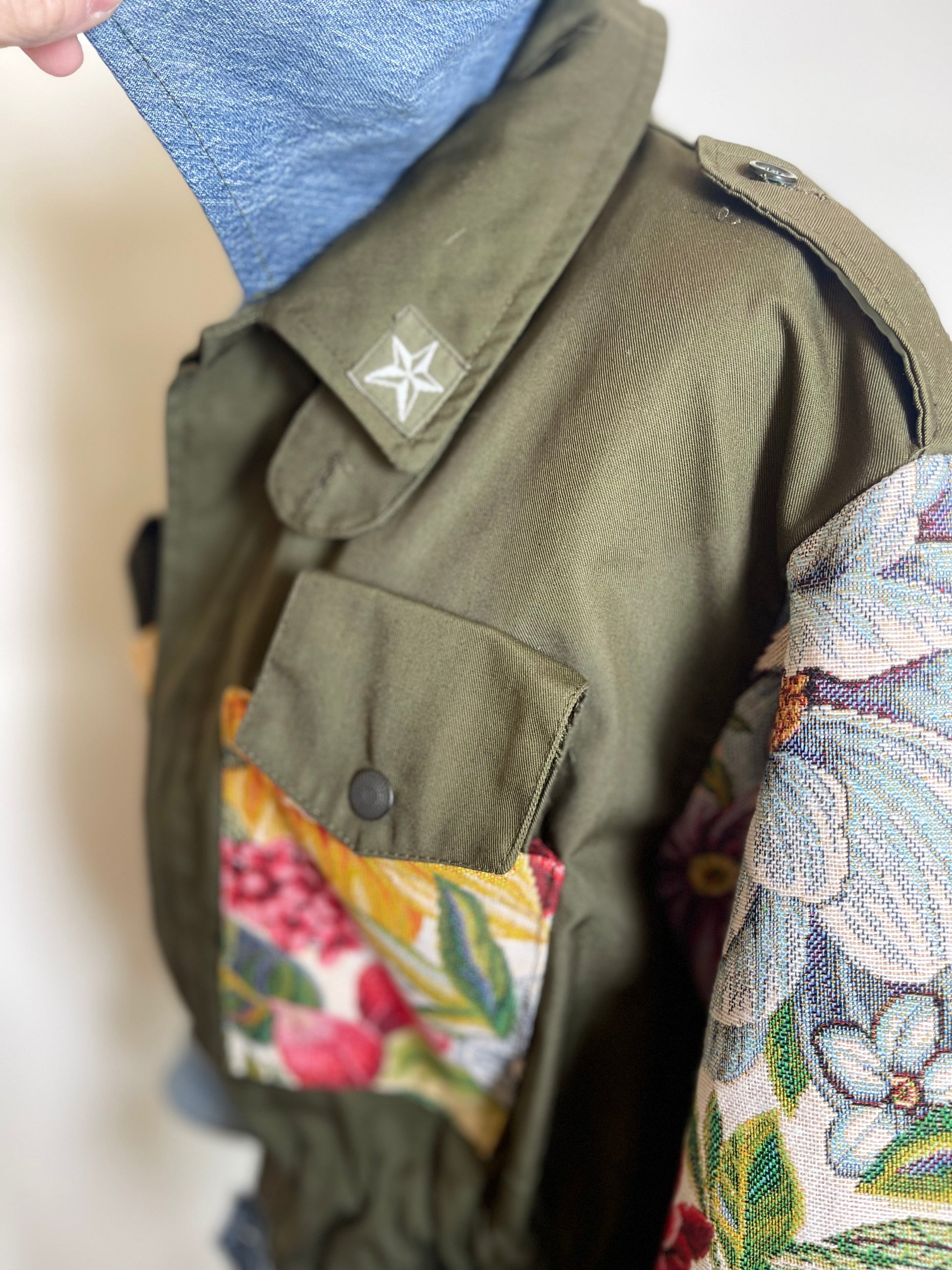 Il Bomber Sunflower è una giacca militare originale italiana trasformata in un capo unico e alla moda. Le maniche balloon aggiungono uno stile unico, mentre il tessuto gobelin floreale aggiunge un tocco di colore e trama. Con questo bomber, sei al passo con la moda e rispettoso dell'ambiente.