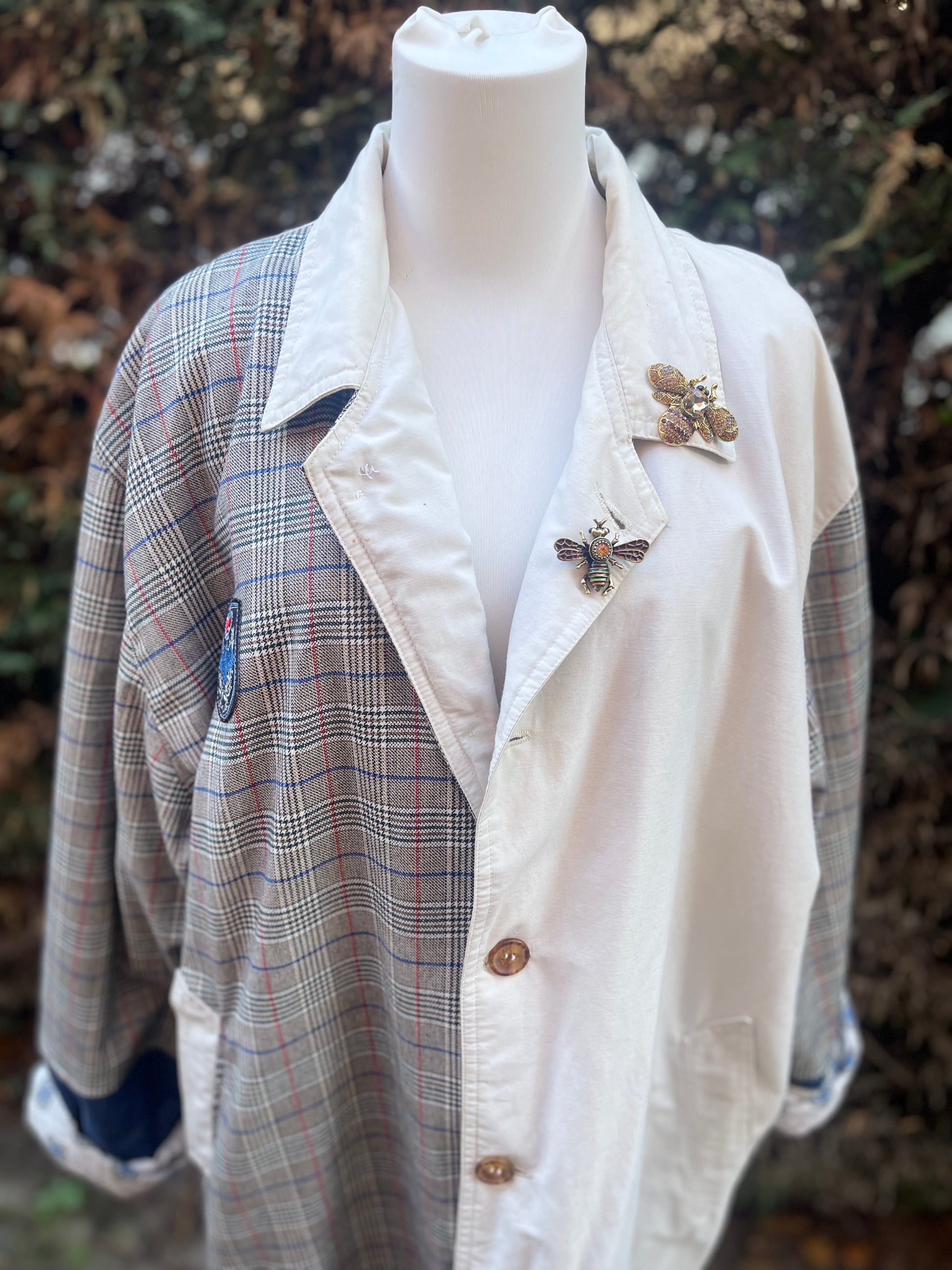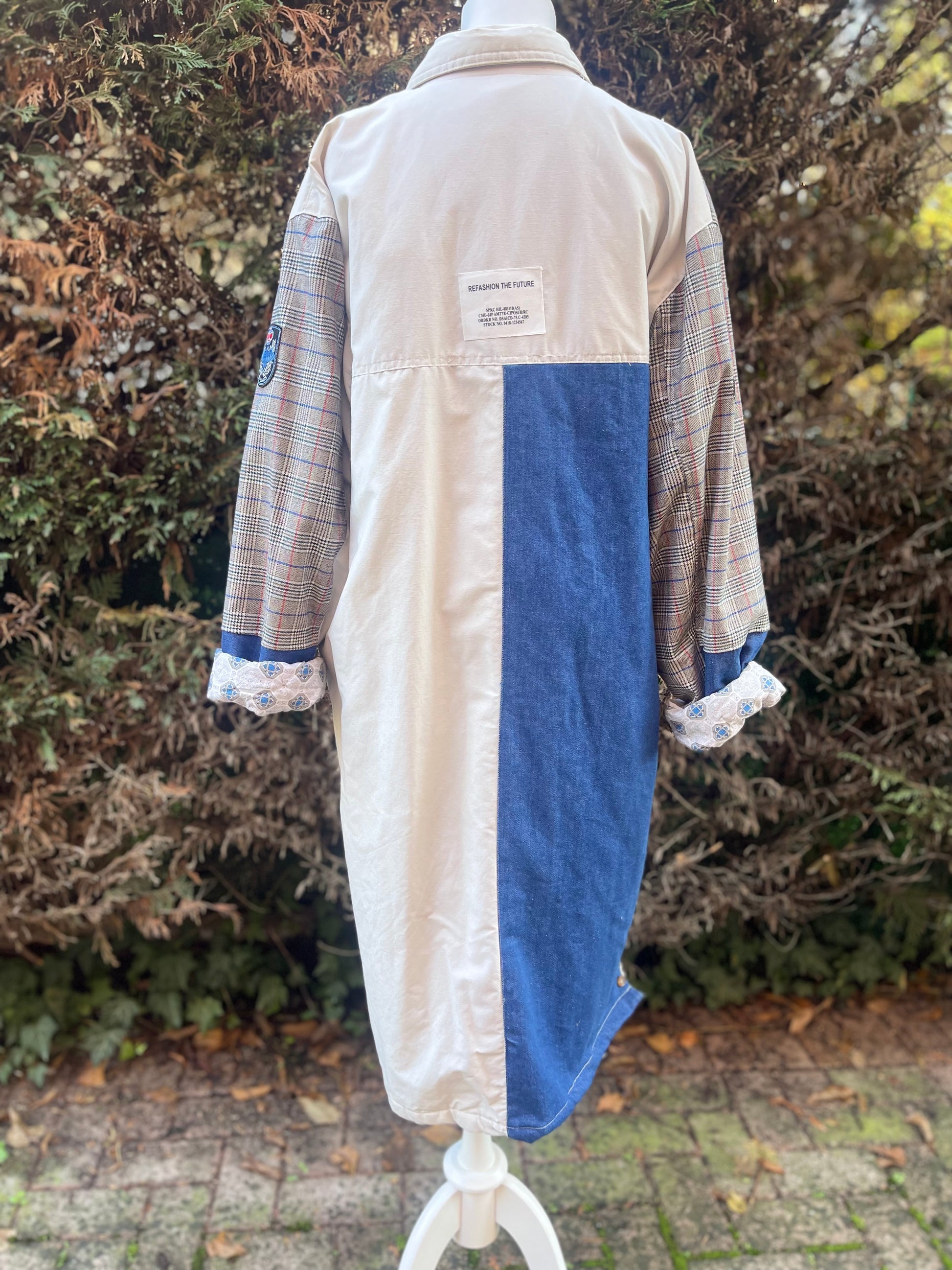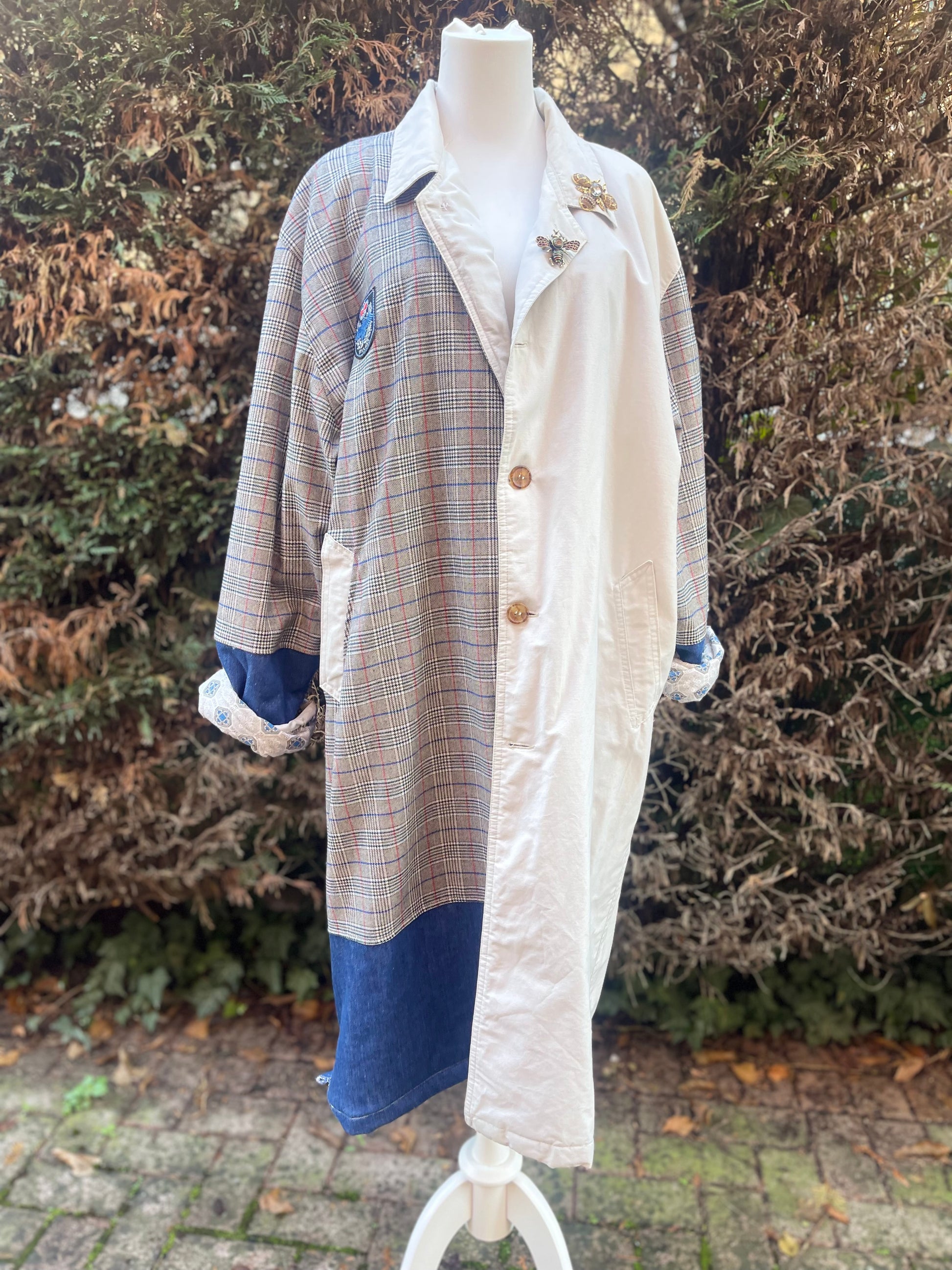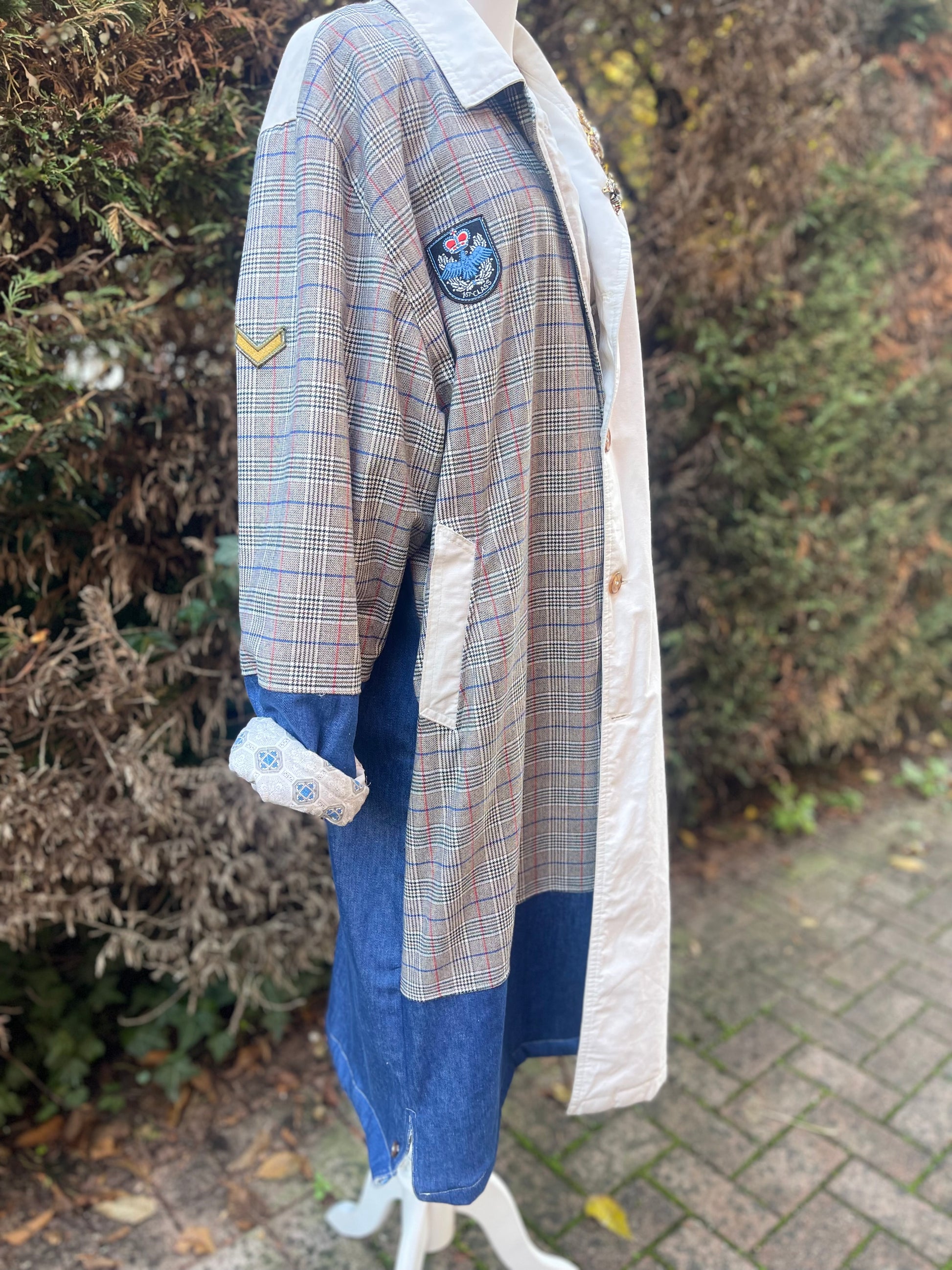 Questo Trench Madam è un capo unico, un mix originale di vintage e upcycling. Realizzato con una lana Check nei toni del grigio e blu, è decostruito e ricostruito per un look unico e di tendenza. Arricchito da inserti in tessuto denim, aggiunge un tocco di modernità al classico design anni '80. Internamente è imbottito per garantire calore e comfort,